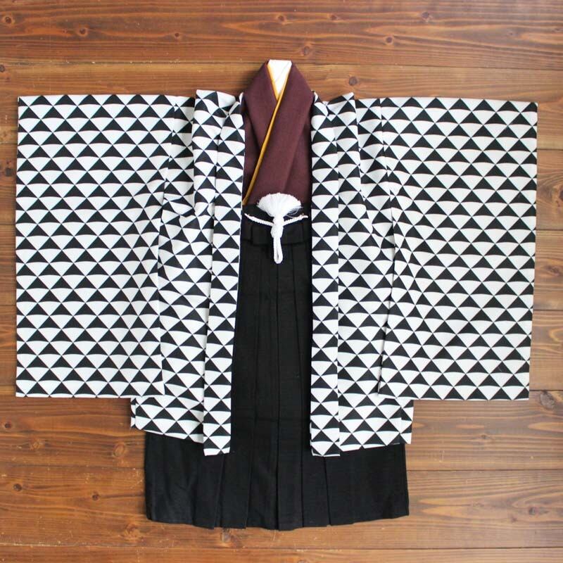 羽織(羽織紐付き)、袴、袴用着物の3点セットです。